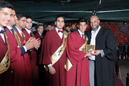 وفي الختام تم تقديم دروع تكريمية لأوائل الطلبة في الفرعين العلمي والعلوم الإنسانية فكان الطالب صبحي عمر صبحي معتوق الأول على الفرع العلمي والطالبين عمار فؤاد أكرم حمدية الأول على الفرع العلوم الإنسانية (أ) والطالب خالد زياد نجاتي سنقرط الأول على الفرع العلوم الإنسانية (ب) ومن ثم قام سماحة الشيخ عبد العظيم سلهب رئيس مجلس الأمناء وفضيلة الشيخ جميل حمامي المدير التنفيذي لمدارس الإيمان ومدير المدرسة الأستاذ جمال الباشا بتقديم الشهادات لخريجي الفرعين العلمي والعلوم الإنسانية التالية أسماؤهم:
