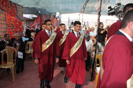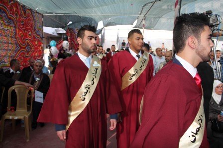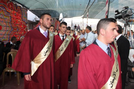 وقد افتتحت فعاليات الحفل بدخول موكب الخريجين وسط وقوف الأهالي الذين رحبوا ترحيباً حاراً بالخريجين وافتتح فعاليات الحفل عريف الحفل الأستاذ عماد الزغل، حيث رتل الطالب يوسف نصري أبو سنينة ايات من الذكر الحكيم ، تلاه عرض كشفي لطلبة مدارس الإيمان .