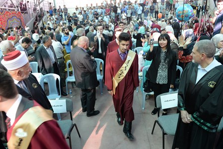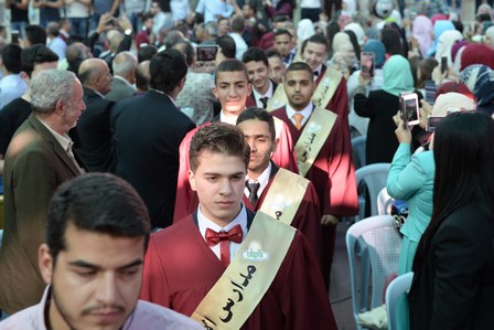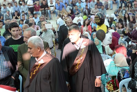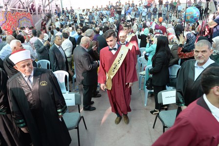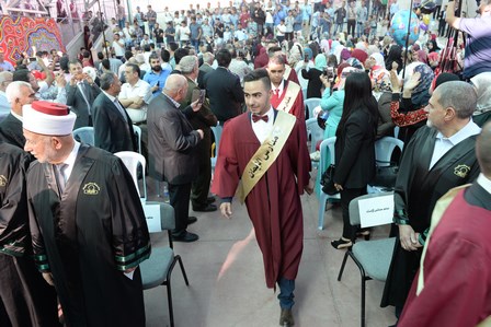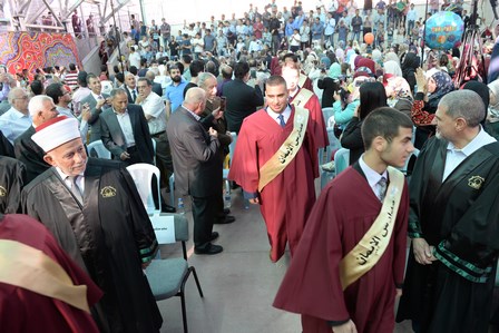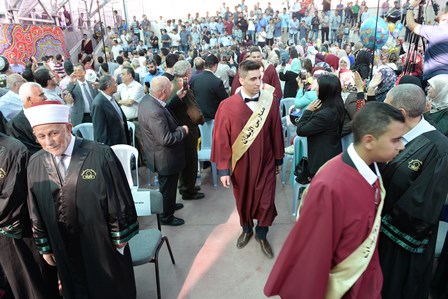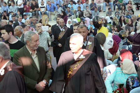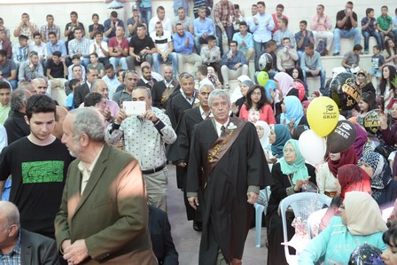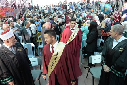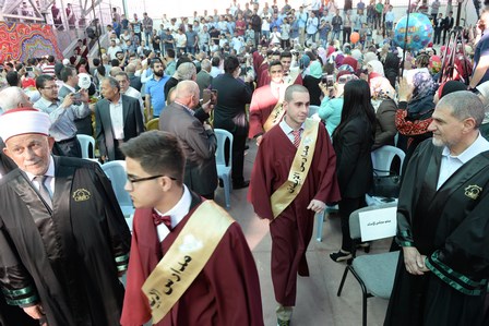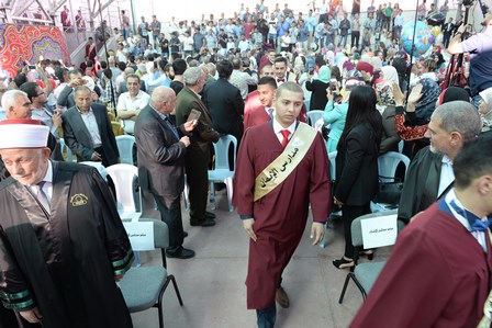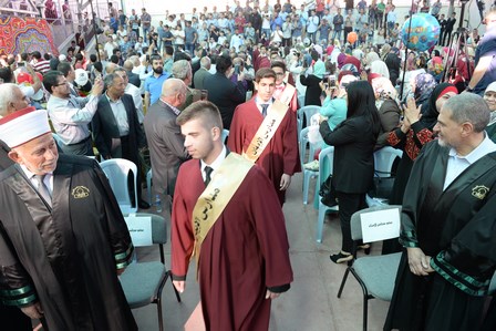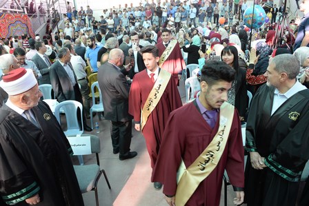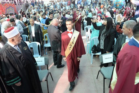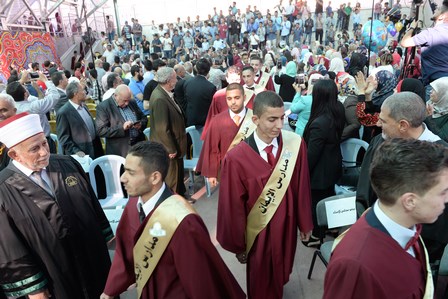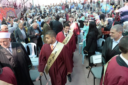 وقد افتتحت فعاليات الحفل بدخول موكب الخريجين وسط وقوف الأهالي الذين رحبوا ترحيباً حاراً بالخريجين وافتتح فعاليات الحفل عريف الحفل الأستاذ عادل أبو دهيم ، وقام الطالب عمر الشايب بترتيل آيات من الذكر الحكيم .